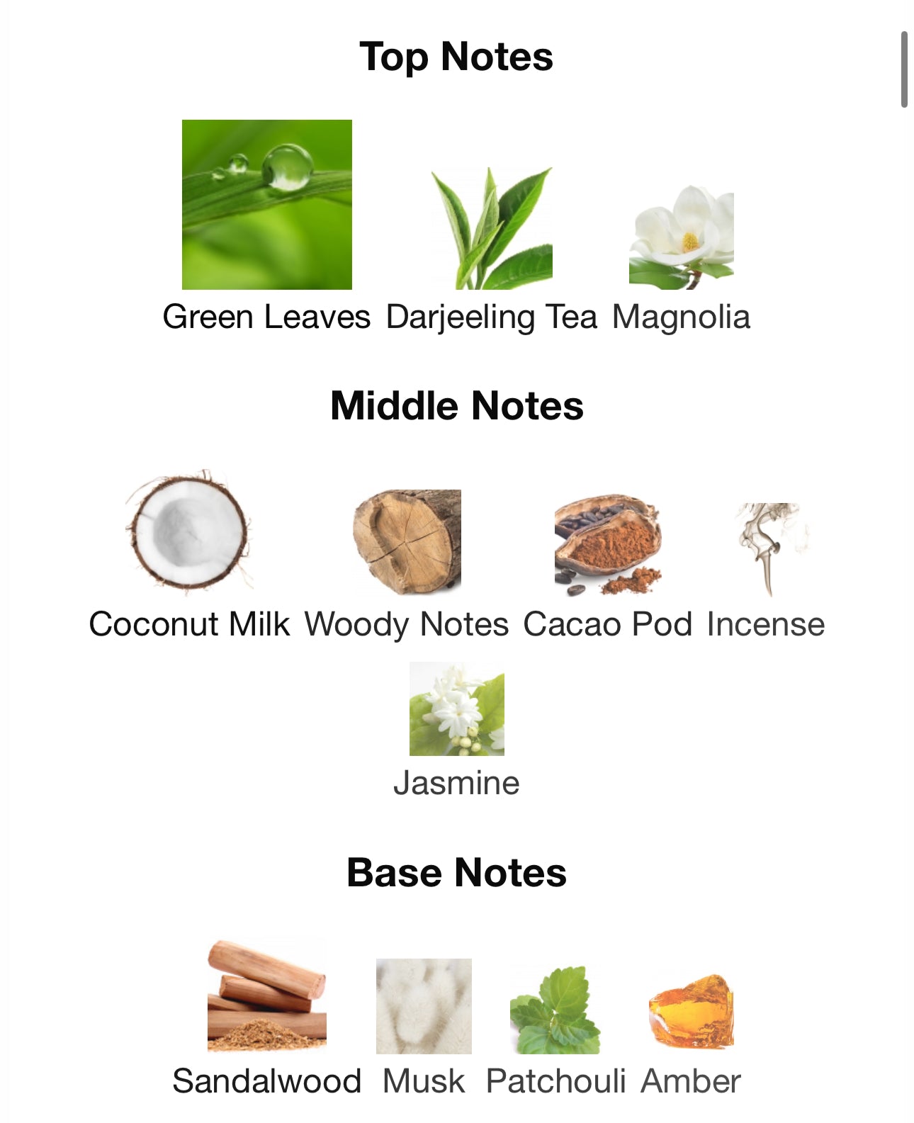Lush green leaves and steaming Darjeeling drift into a creamy heart of coconut milk, woods, and soft florals, before settling into a tranquil trail of sandalwood, musk, patchouli and amber. A serene, creamy-woody aura with a tea-tinged breeze—comforting yet majestic.