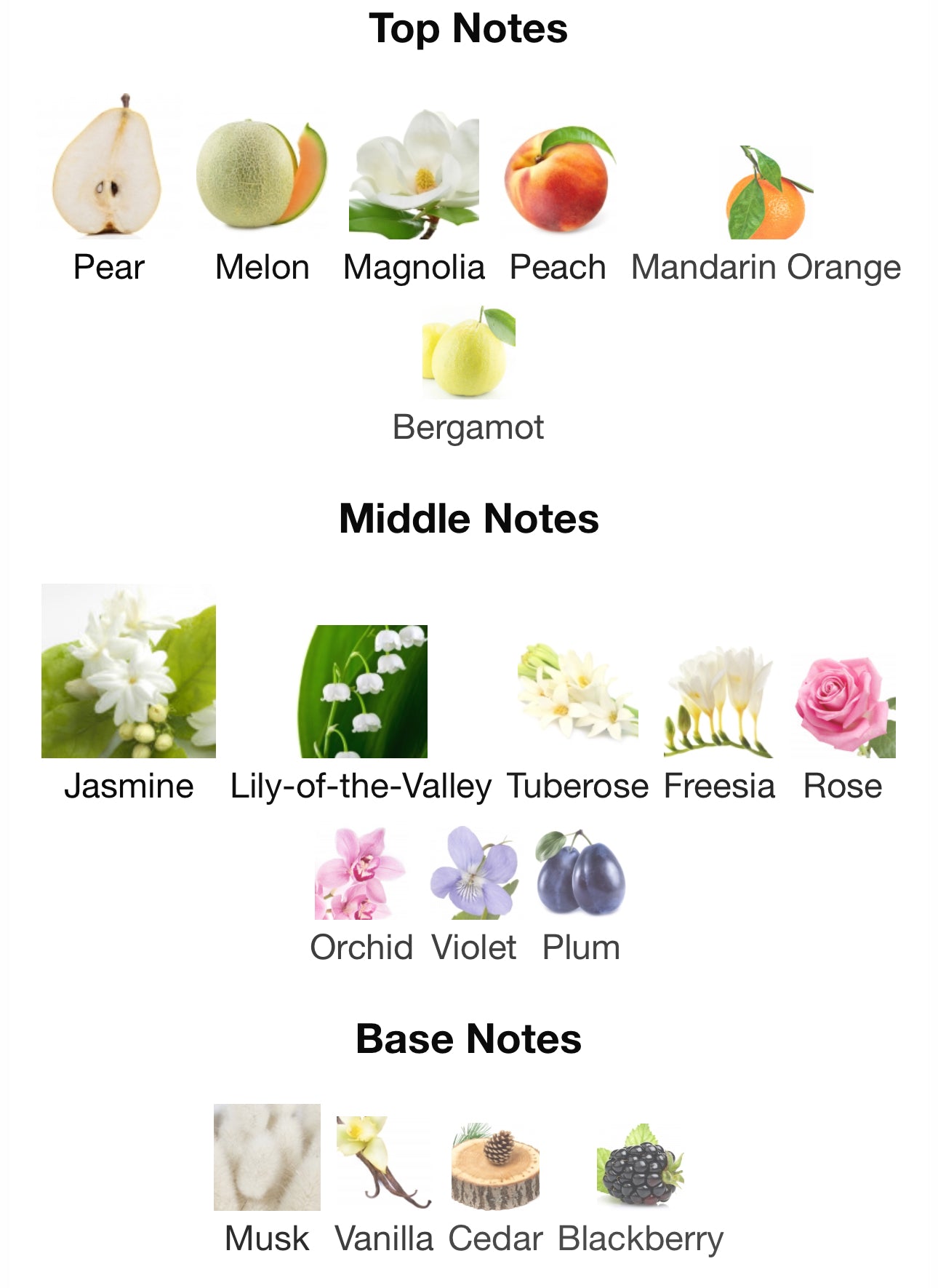 Top: Pear, Melon, Magnolia, Peach, Mandarin Orange, Bergamot