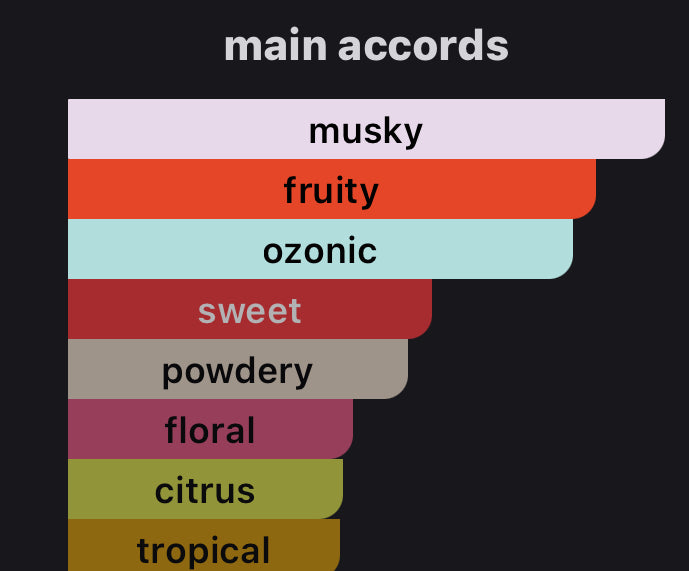 Main accords: musky, fruity, ozonic, sweet, powdery, floral, citrus, tropical.