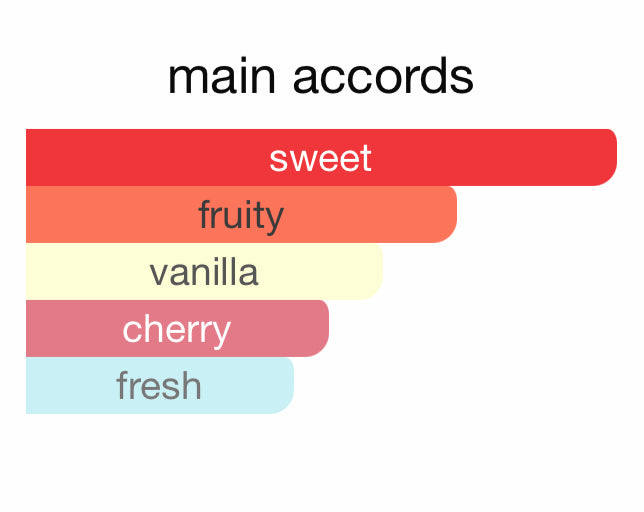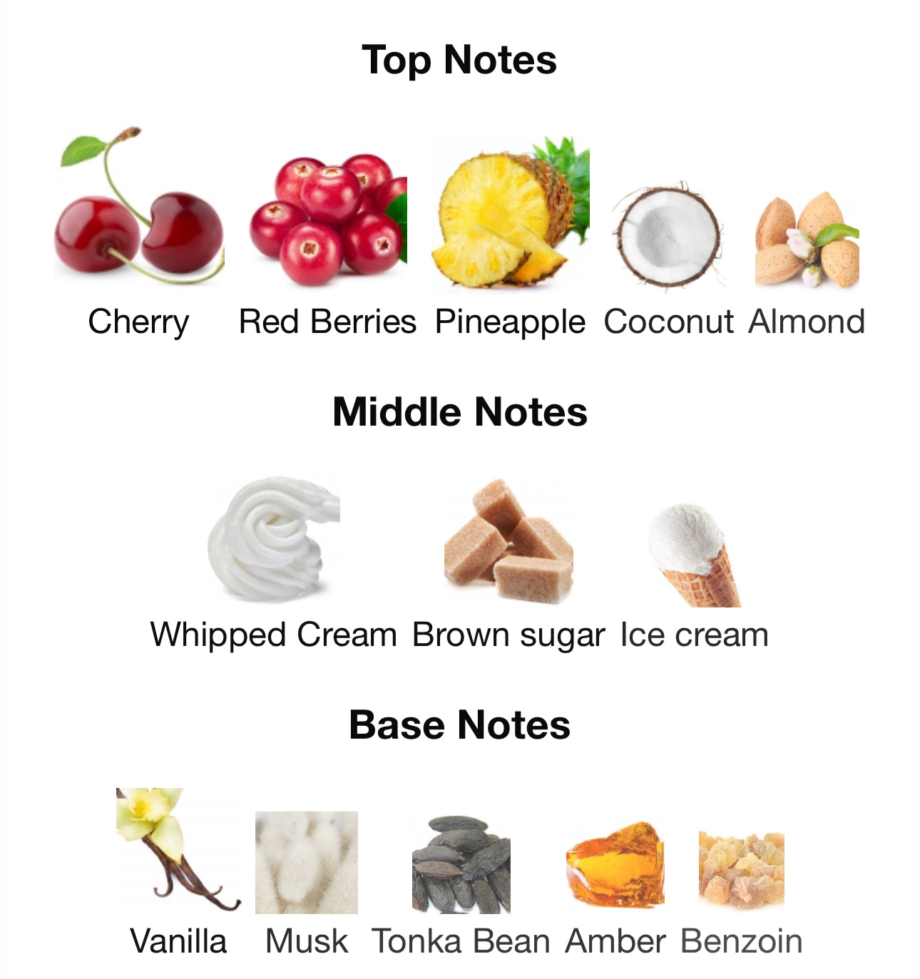 - Top Notes: Cherry, Red Berries, Pineapple, Coconut, Almond
