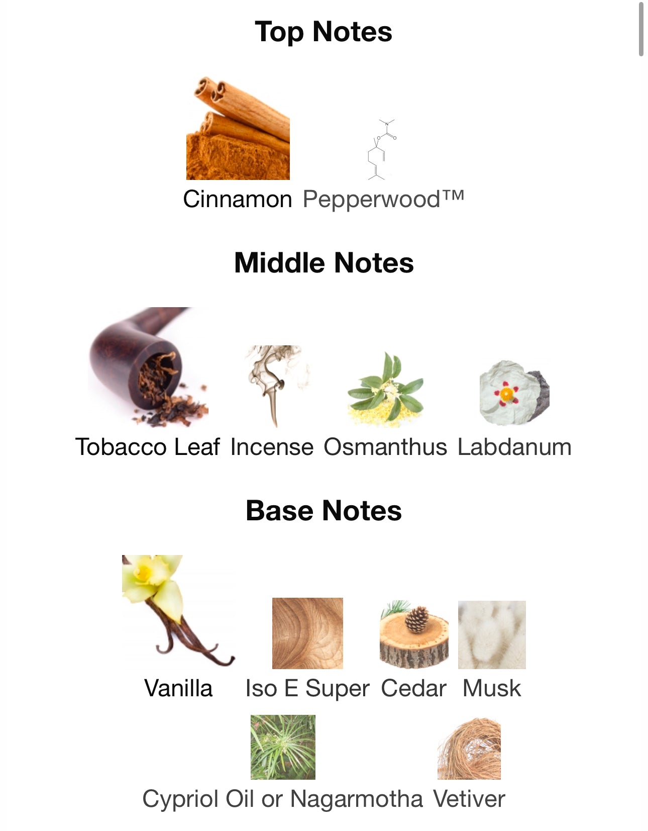 - Base: Vanilla, Iso E Super, Cedar, Musk, Cypriol (Nagarmotha), Vetiver