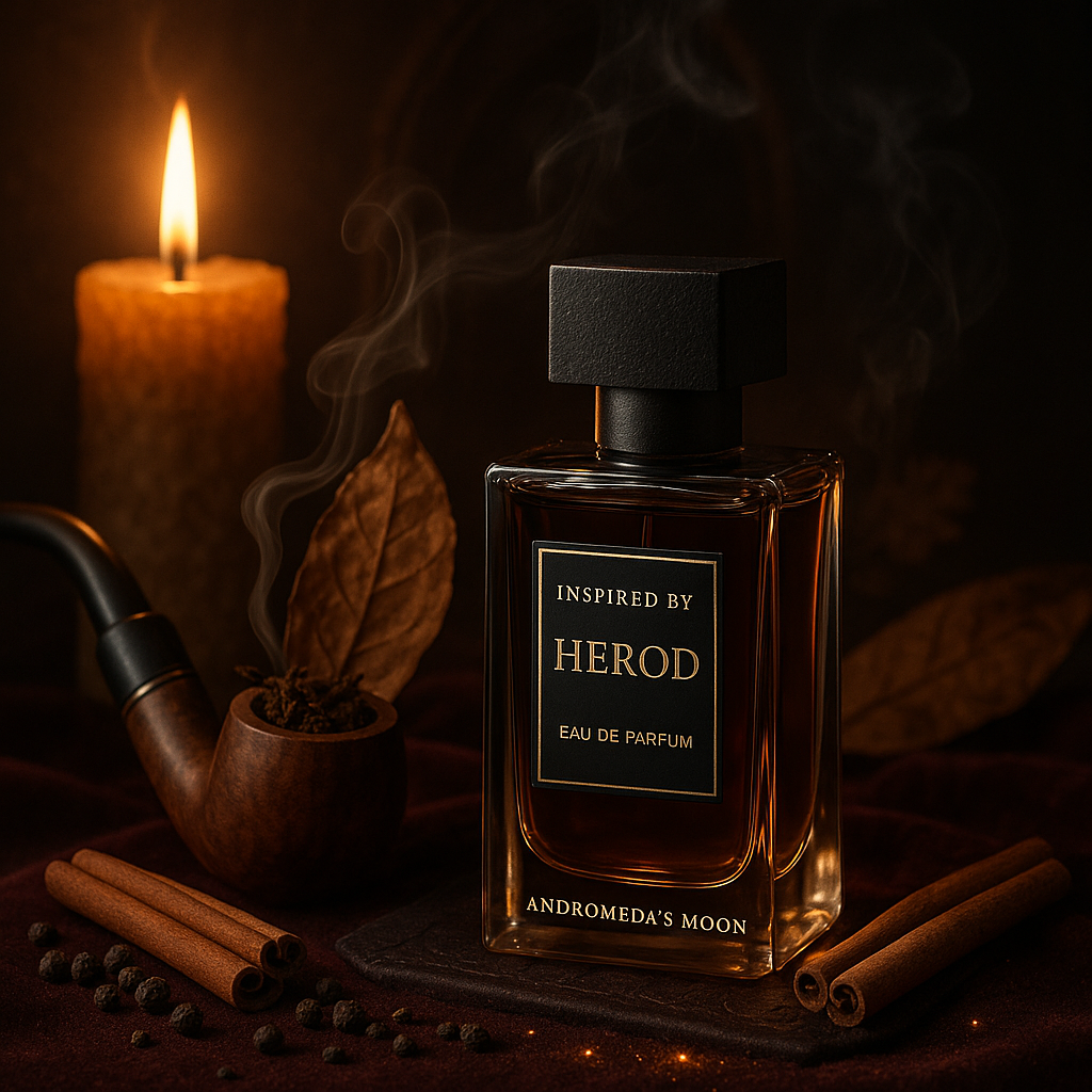 Inspired by Herod is a darkly seductive fragrance for those who crave warmth, mystery, and timeless elegance. Cinnamon and Pepperwood™ ignite the senses with a sharp, dry heat, while rich tobacco leaf and labdanum resin curl like incense in the dusk. As it settles, silky vanilla and smooth cedar wrap the skin in a cloak of comforting depth, enhanced by earthy vetiver and a whisper of musky spice.