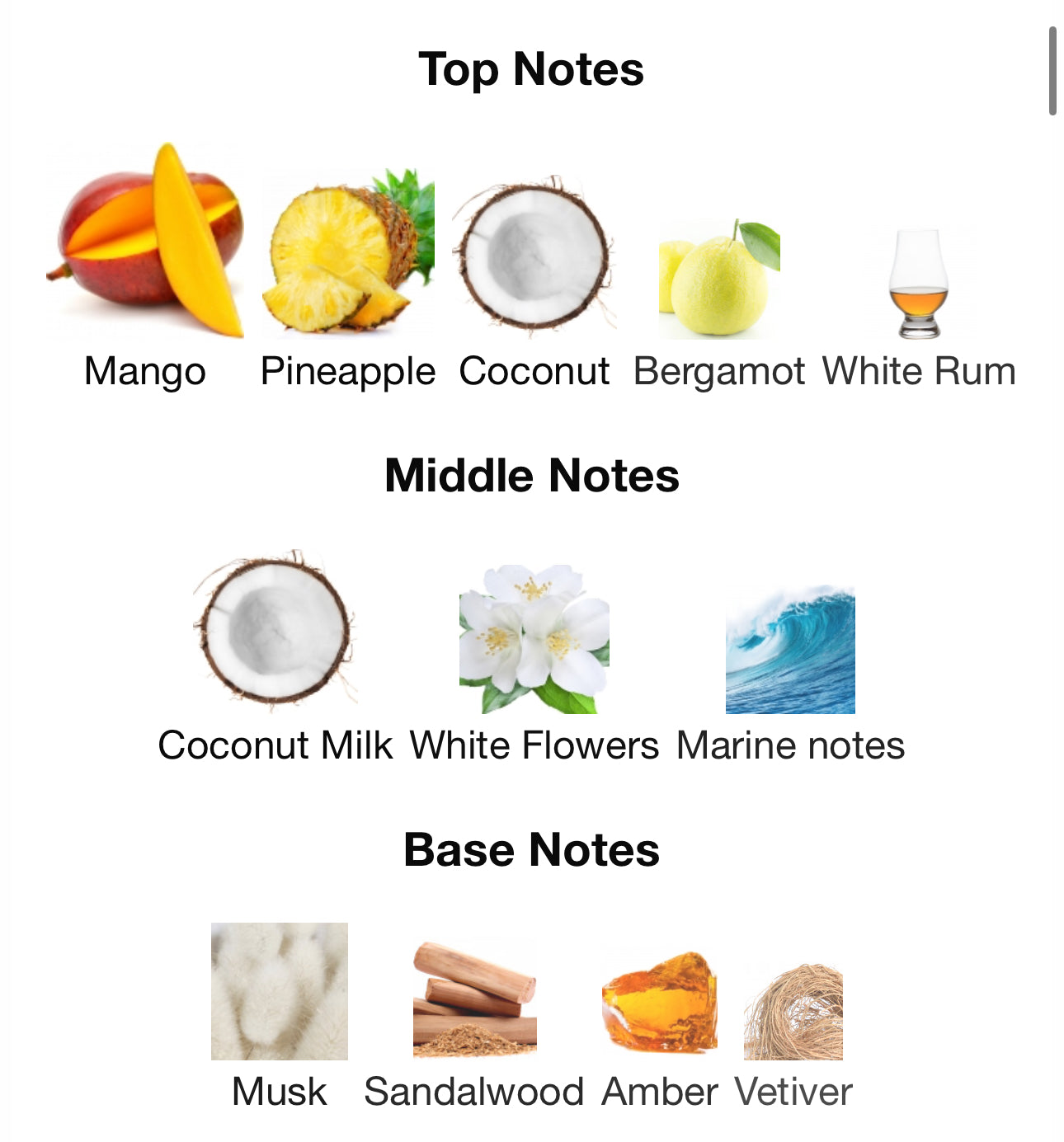 Bold, vibrant, and unforgettable. A rush of exotic mango and pineapple drizzled with creamy coconut and bright bergamot evokes a beachside cocktail at golden hour. A heart of lush coconut milk and airy white florals mingles with salty marine notes—sun-drenched waves and warm breezes. The dry-down glows with sensual musk, smooth sandalwood, and amber, grounded by a whisper of vetiver. Sunshine in full force.