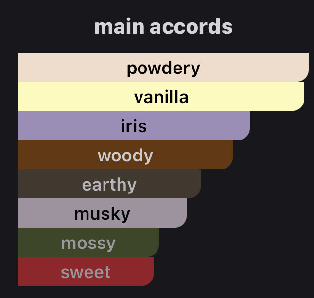 Main Accords: powdery • vanilla • iris • woody • musky • mossy