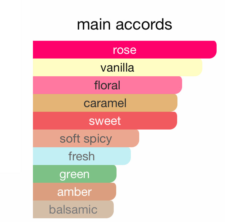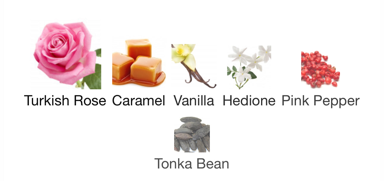 Imagine a bouquet of Turkish rose dipped in caramel—then wrapped in a cloud of creamy vanilla and kissed with sparkling pink pepper. Hedione keeps it glowing and airy, while tonka melts everything into a warm, addictive finish.