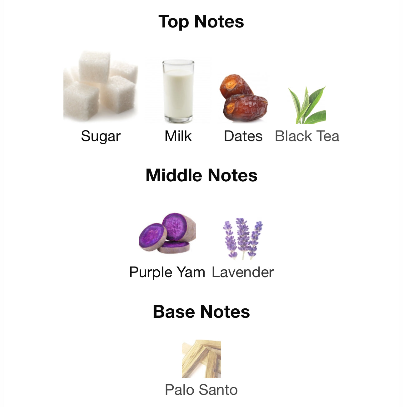 Sugar Crystals Milk Froth Dates Black Tea Purple Yam (Ube) Lavender Palo Santo