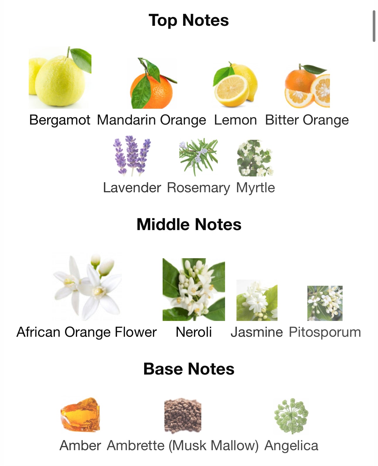 Bergamot, Mandarin Orange, Lemon, Bitter Orange, Lavender, Rosemary, Myrtle