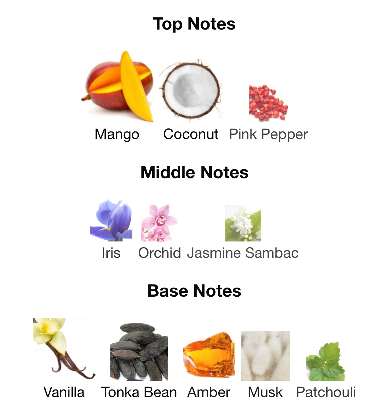 A playful celestial gourmand where sunny mango & coconut orbit a soft floral heart of iris, orchid & jasmine sambac, melting into a glowing base of vanilla, tonka, amber, musk & patchouli. Lively, sweet, and otherworldly — fruit & starlight.